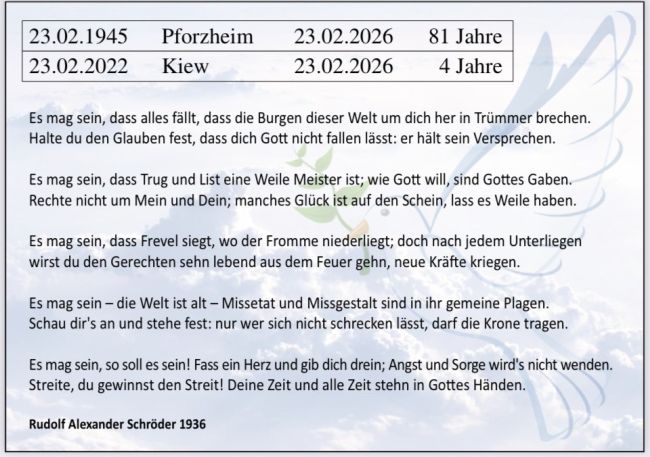 Unser Gedanke zu zwei Ereignissen: Zerstörung Pforzheirm 1945 Kriegsbeginn Ukraine 2022
